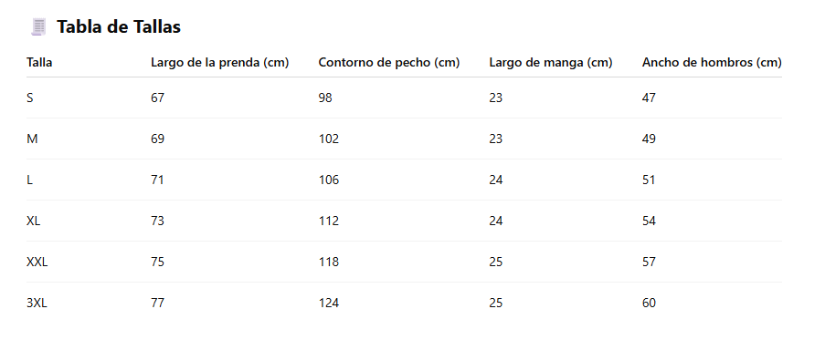 Tallas disponibles: S, M, L, XL, 2XL, 3XL